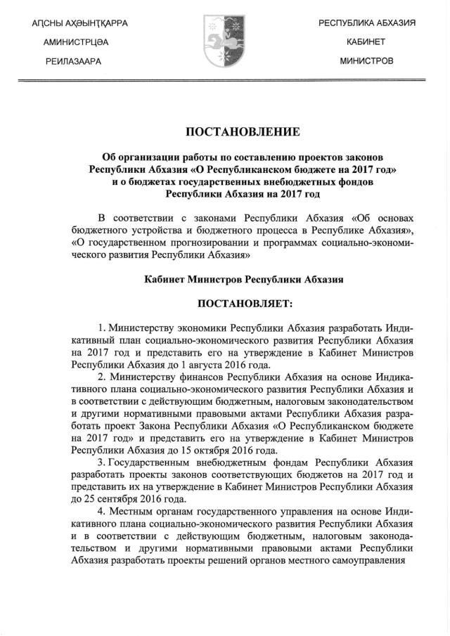 Постановление Кабинета Министров Республики Абхазия от 05.07.2016 № 117 "Об организации работы по составлению проектов законов Республики Абхазия "О Республиканском бюджете на 2017 год" и о бюджетах государственных внебюджетных фондов Республики Абхазия на 2017 год"