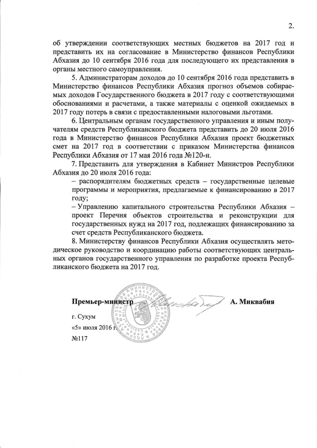 Постановление Кабинета Министров Республики Абхазия от 05.07.2016 № 117 "Об организации работы по составлению проектов законов Республики Абхазия "О Республиканском бюджете на 2017 год" и о бюджетах государственных внебюджетных фондов Республики Абхазия на 2017 год"