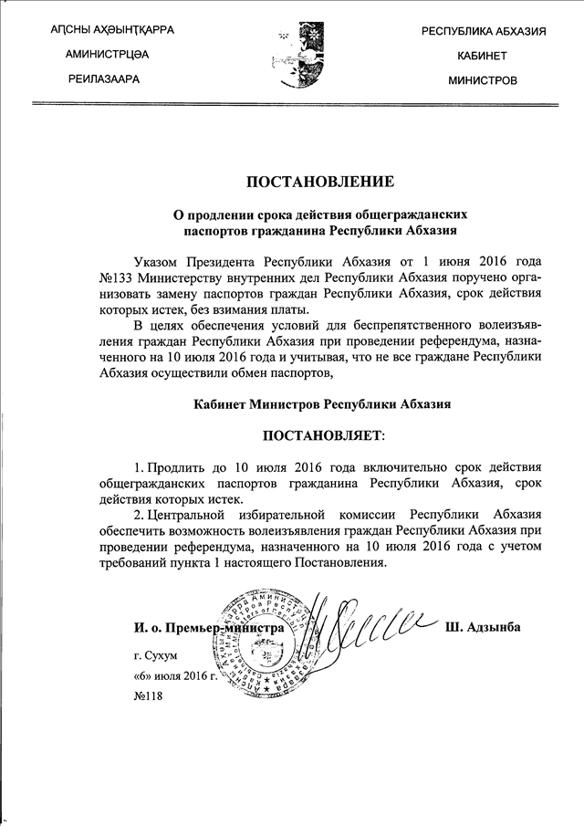 Постановление Кабинета Министров Республики Абхазия от 06.07.2016 № 118 "О продлении срока действия общегражданских паспортов гражданина Республики Абхазия"