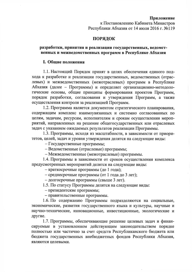 Постановление Кабинета Министров Республики Абхазия от 14.07.2016 № 119 "Об утверждении "Порядка разработки, принятия и реализации государственных, ведомственных и межведомственных программ в Республике Абхазия"
