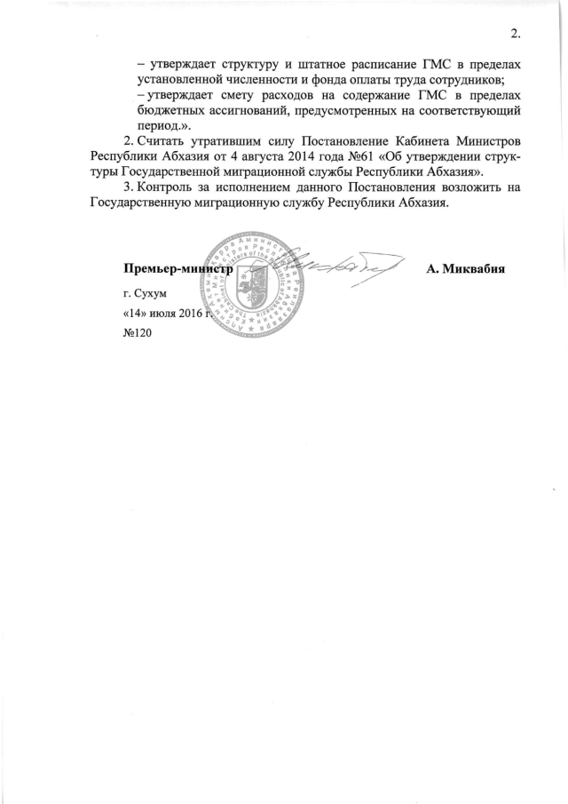 Постановление Кабинета Министров Республики Абхазия от 14.07.2016 № 120 "О внесении изменений в "Положение о Государственной миграционной службе Республики Абхазия>, утвержденное Постановлением Кабинета Министров Республики Абхазия от 31 мая 2012 года № 68"