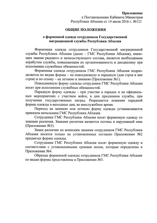 Постановление Кабинета Министров Республики Абхазия от 14.07.2016 № 121 "Об утверждении форменной одежды сотрудников Государственной миграционной службы Республики Абхазия"