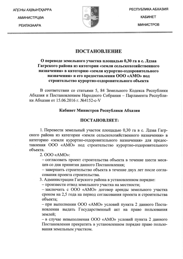 Постановление Кабинета Министров Республики Абхазия от 14.07.2016 № 125 "О переводе земельного участка площадью 0,30 га в с. Лдзаа Гагрского района из категории "земли сельскохозяйственного назначения" в категорию "земли курортно-оздоровительного назначения" и его предоставлении ООО "АМО" под строительство курортно-оздоровительного объекта"