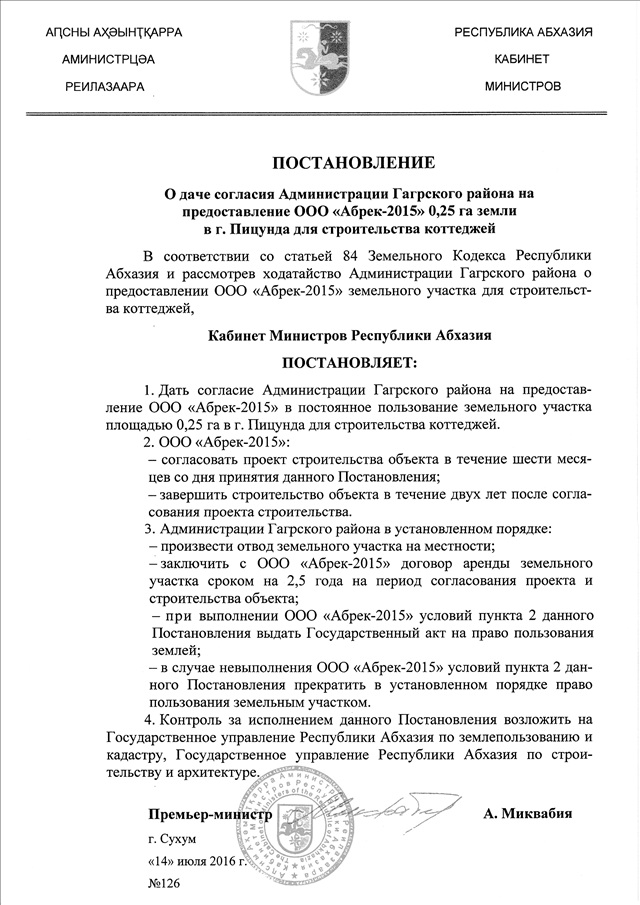 Постановление Кабинета Министров Республики Абхазия от 14.07.2016 № 126 "О даче согласия Администрации Гагрского района на предоставление ООО "Абрек-2015" 0,25 га земли в г. Пицунда для строительства коттеджей"