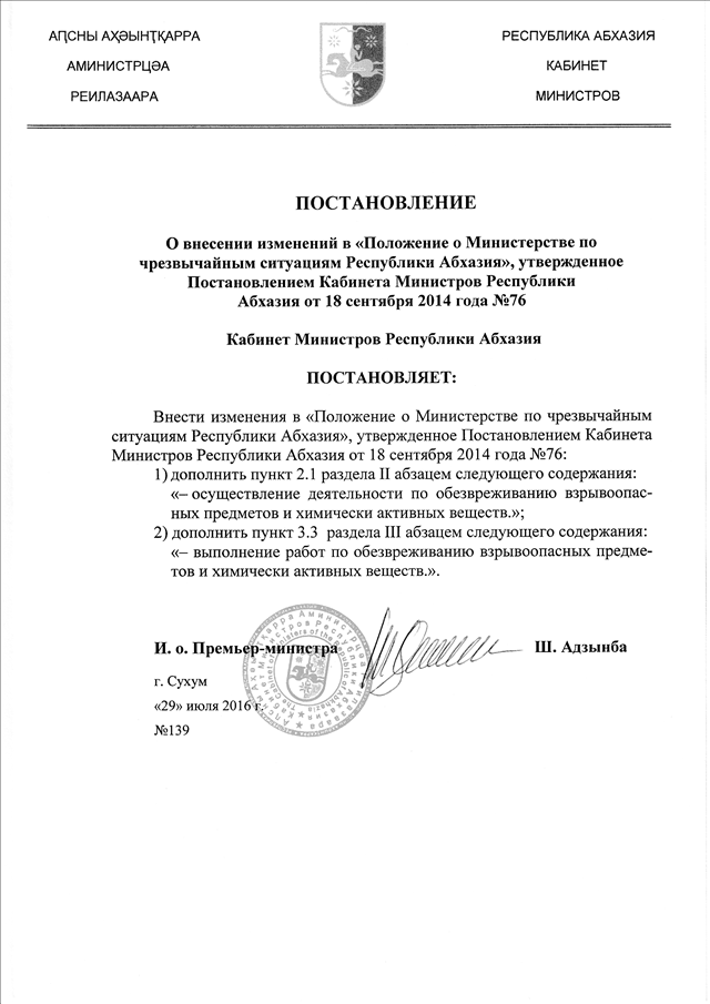 Постановление Кабинета Министров Республики Абхазия от 29.07.2016 № 139 "О внесении изменений в "Положение о Министерстве по чрезвычайным ситуациям Республики Абхазия", утвержденное Постановлением Кабинета Министров Республики Абхазия от 18 сентября 2014 года № 76"