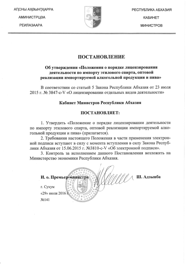 Постановление Кабинета Министров Республики Абхазия от 29.07.2016 № 141 "Об утверждении "Положения о порядке лицензирования деятельности по импорту этилового спирта, оптовой реализации импортируемой алкогольной продукции и пива"