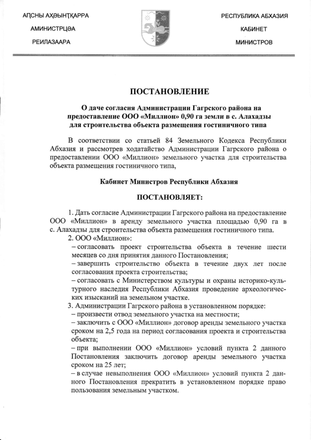 Постановление Кабинета Министров Республики Абхазия от 29.07.2016 № 148 "О даче согласия Администрации Гагрского района на предоставление ООО "Миллион" 0,90 га земли в с. Алахадзы для строительства объекта размещения гостиничного типа"