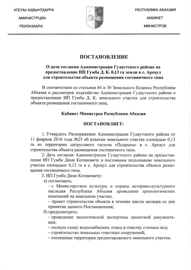 Постановление Кабинета Министров Республики Абхазия от 29.07.2016 № 150 "О даче согласия Администрации Гудаутского района на предоставление ИП Гумба Д.К. 0,13 га земли в с. Арсаул для строительства объекта размещения гостиничного типа"