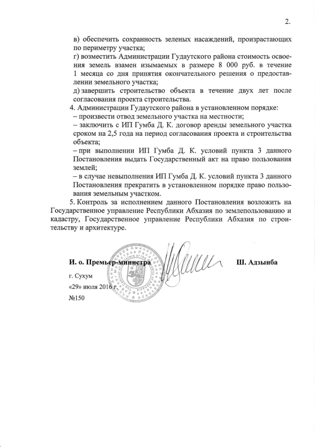 Постановление Кабинета Министров Республики Абхазия от 29.07.2016 № 150 "О даче согласия Администрации Гудаутского района на предоставление ИП Гумба Д.К. 0,13 га земли в с. Арсаул для строительства объекта размещения гостиничного типа"