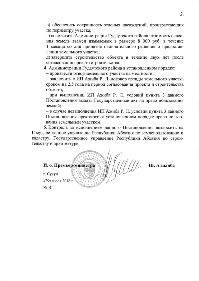 Постановление Кабинета Министров Республики Абхазия от 29.07.2016 № 151 "О даче согласия Администрации Гудаутского района на предоставление ИП Ажиба Р.Л. 0,17 га земли в г. Новый Афон для строительства объекта размещения гостиничного типа"