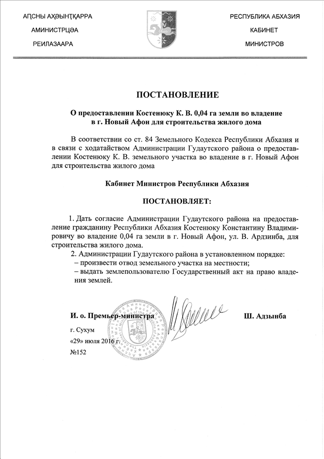 Постановление Кабинета Министров Республики Абхазия от 29.07.2016 № 152 "О предоставлении Костенюку К.В. 0,04 га земли во владение в г. Новый Афон для строительства жилого дома"