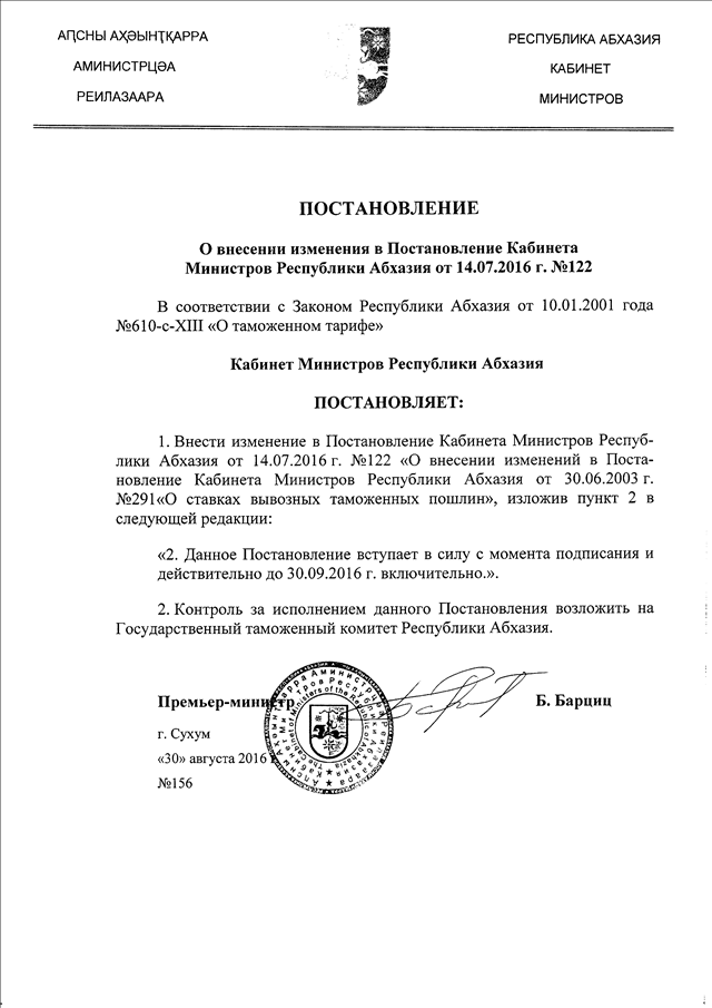 Постановление Кабинета Министров Республики Абхазия от 30.08.2016 № 156 "О внесении изменения в Постановление Кабинета Министров Республики Абхазия от 14.07.2016 г. № 122"