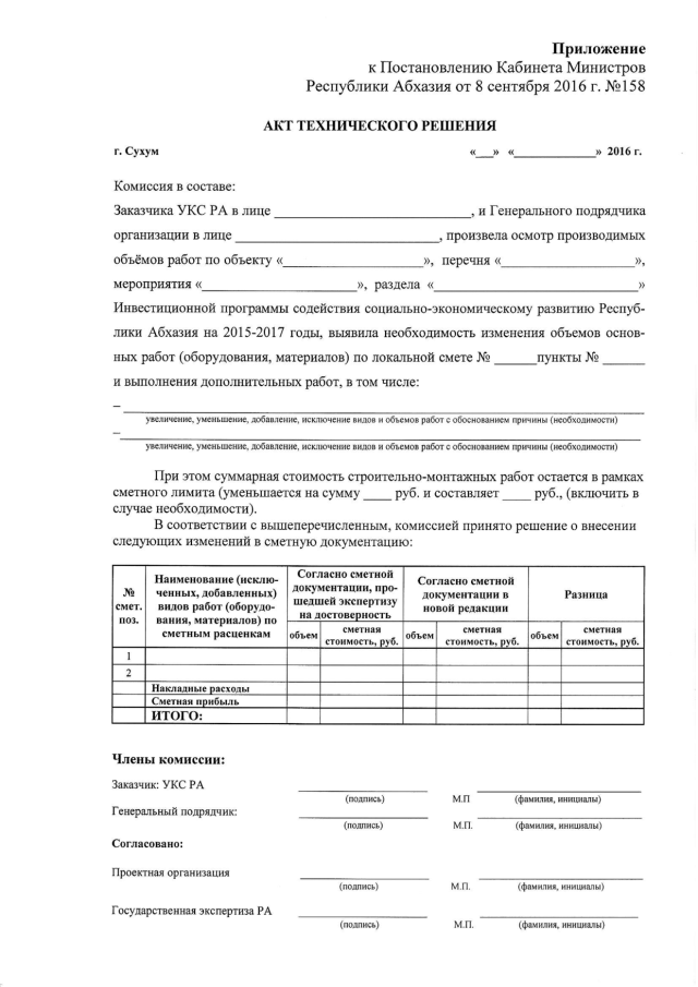 Постановление Кабинета Министров Республики Абхазия от 08.09.2016 № 158 "О порядке оформления документации при корректировке объемов и видов работ в рамках реализации Инвестиционной программы содействия социально-экономическому развитию Республики Абхазия на 2015-2017 годы"