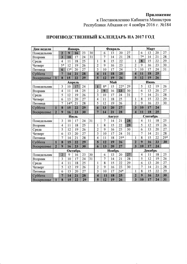 Постановление Кабинета Министров Республики Абхазия от 04.11.2016 № 184 "Об утверждении Производственного календаря на 2017 год"