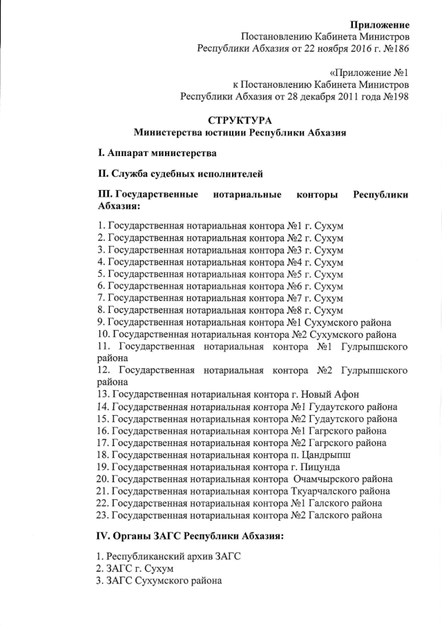 Постановление Кабинета Министров Республики Абхазия от 22.11.2016 № 186 "О внесении изменений в Постановление Кабинета Министров Республики Абхазия от 28 декабря 2011 г. № 198 "Об утверждении структуры и Перечня подведомственных Министерству юстиции Республики Абхазия организаций"