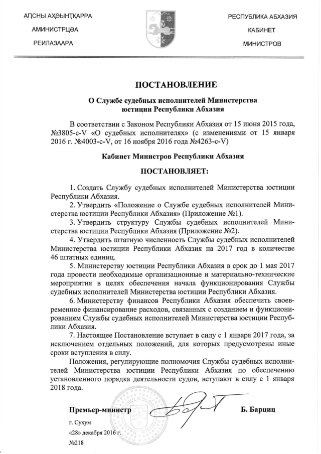 Постановление Кабинета Министров Республики Абхазия от 28.12.2016 № 218 "О Службе судебных исполнителей Министерства юстиции Республики Абхазия"