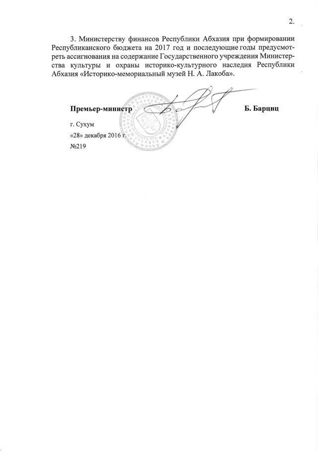 Постановление Кабинета Министров Республики Абхазия от 28.12.2016 № 219 "О создании Государственного учреждения Министерства культуры и охраны историко-культурного наследия Республики Абхазия "Историко-мемориальный музей Н.А. Лакоба"