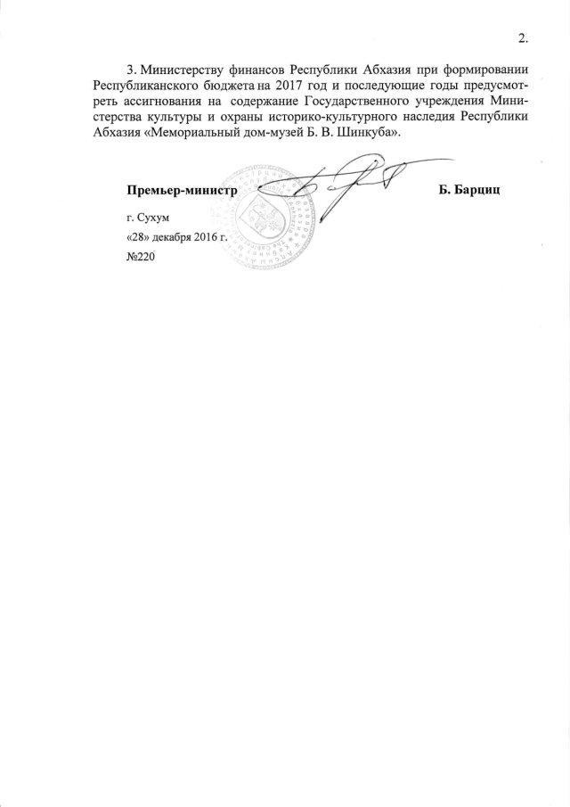 Постановление Кабинета Министров Республики Абхазия от 28.12.2016 № 220 "О создании Государственного учреждения Министерства культуры и охраны историко-культурного наследия Республики Абхазия "Мемориальный дом-музей Б.В. Шинкуба"