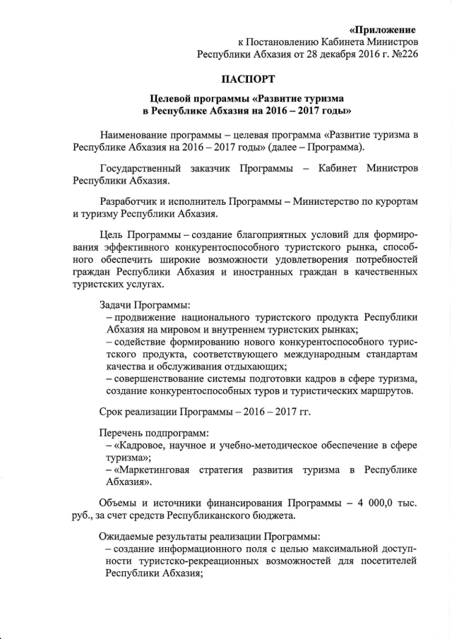 Постановление Кабинета Министров Республики Абхазия от 28.12.2016 № 226 "О внесении изменений в Постановление Кабинета Министров Республики Абхазия от 28 января 2016 г. № 2 "Об утверждении целевой программы "Развитие туризма в Республике Абхазия на 2016 год"