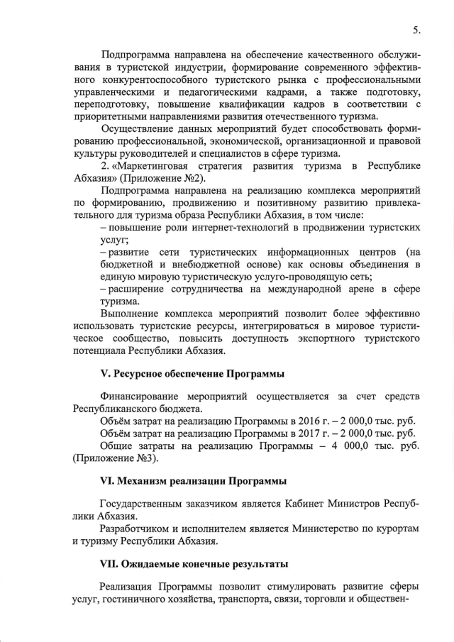 Постановление Кабинета Министров Республики Абхазия от 28.12.2016 № 226 "О внесении изменений в Постановление Кабинета Министров Республики Абхазия от 28 января 2016 г. № 2 "Об утверждении целевой программы "Развитие туризма в Республике Абхазия на 2016 год"