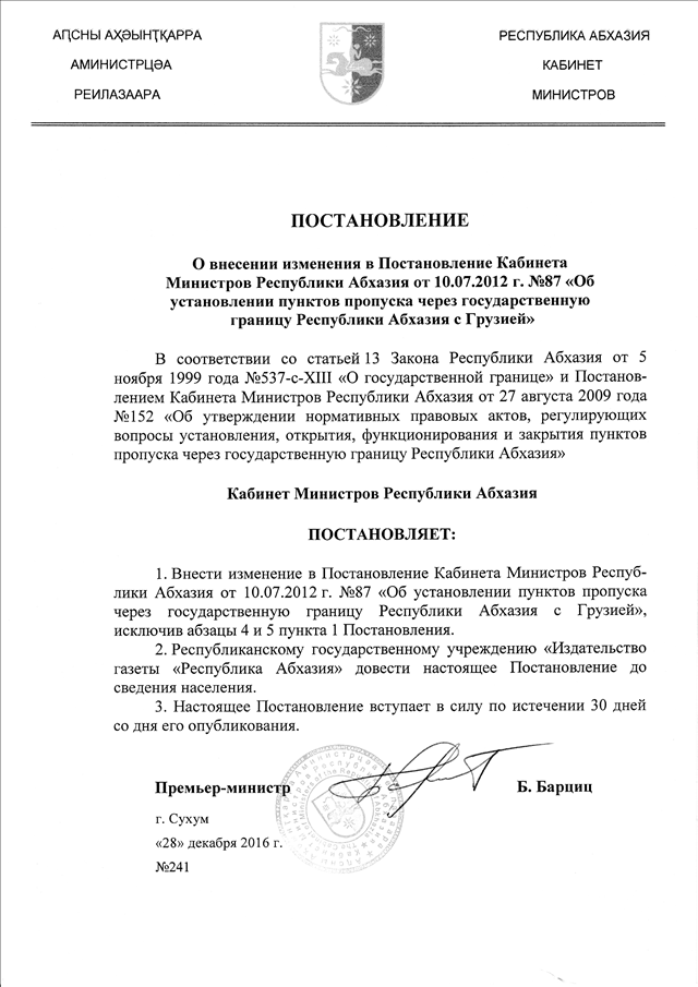 Постановление Кабинета Министров Республики Абхазия от 28.12.2016 № 241 "О внесении изменения в Постановление Кабинета Министров Республики Абхазия от 10.07.2012 г. № 87 "Об установлении пунктов пропуска через государственную границу Республики Абхазия с Грузией"