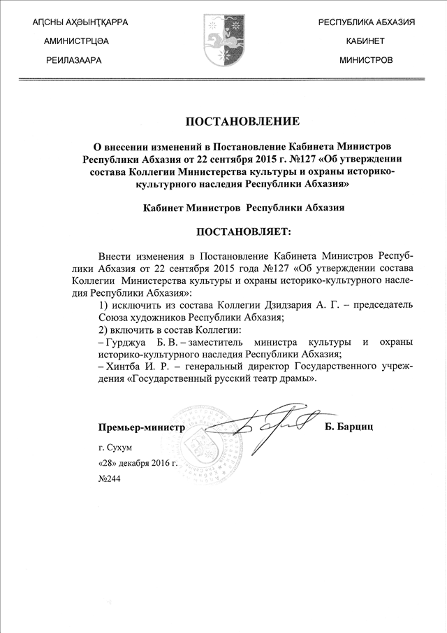 Постановление Кабинета Министров Республики Абхазия от 28.12.2016 № 244 "О внесении изменений в Постановление Кабинета Министров Республики Абхазия от 22 сентября 2015 г. № 127 "Об утверждении состава Коллегии Министерства культуры и охраны историко-культурного наследия Республики Абхазия"