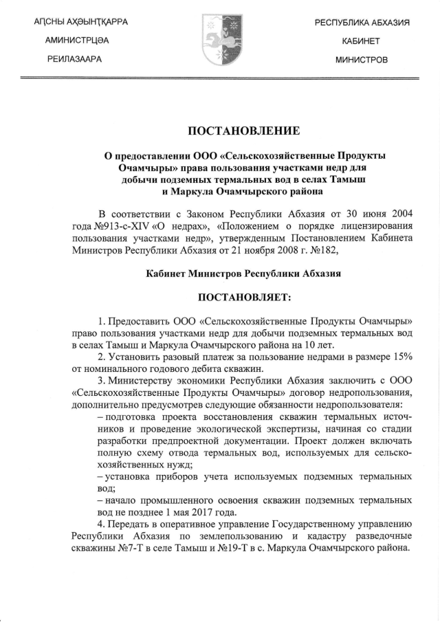 Постановление Кабинета Министров Республики Абхазия от 28.12.2016 № 245 "О предоставлении ООО "Сельскохозяйственные Продукты Очамчыры" права пользования участками недр для добычи подземных термальных вод в селах Тамыш и Маркула Очамчырского района"