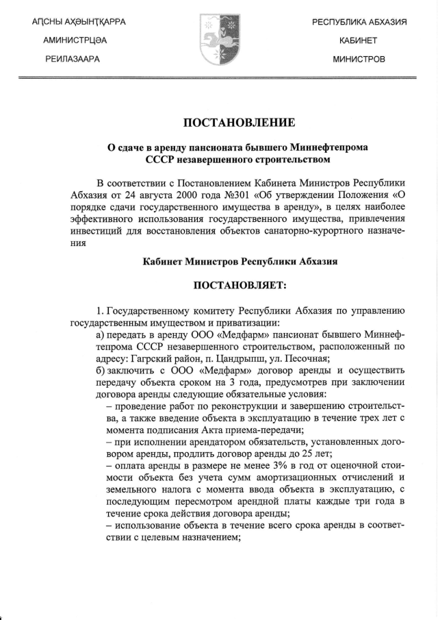 Постановление Кабинета Министров Республики Абхазия от 28.12.2016 № 246 "О сдаче в аренду пансионата бывшего Миннефтепрома СССР незавершенного строительством"