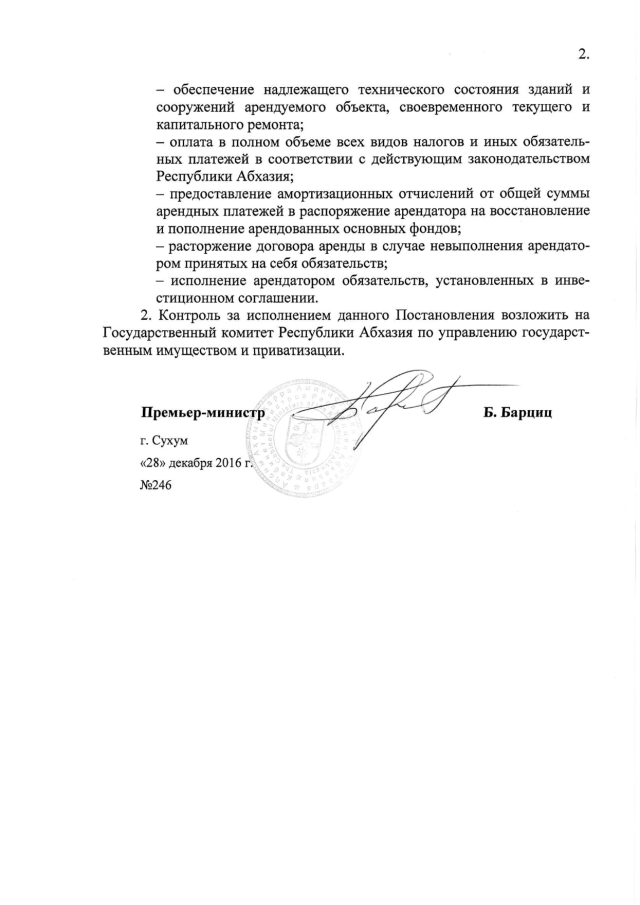 Постановление Кабинета Министров Республики Абхазия от 28.12.2016 № 246 "О сдаче в аренду пансионата бывшего Миннефтепрома СССР незавершенного строительством"
