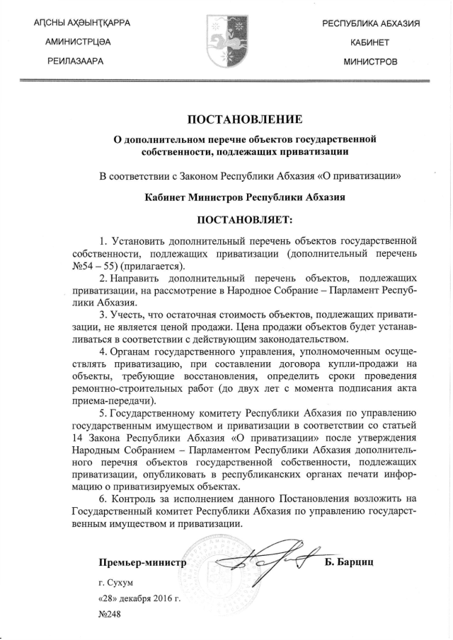 Постановление Кабинета Министров Республики Абхазия от 28.12.2016 № 248 "О дополнительном перечне объектов государственной собственности, подлежащих приватизации"