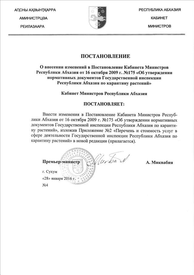 Постановление Кабинета Министров Республики Абхазия от 28.01.2016 № 4 "О внесении изменений в Постановление Кабинета Министров Республики Абхазия от 16 октября 2009 г. № 175 "Об утверждении нормативных документов Государственной инспекции Республики Абхазия по карантину растений"