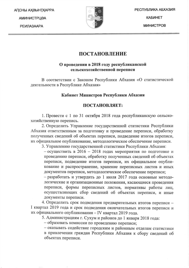 Постановление Кабинета Министров Республики Абхазия от 28.01.2016 № 3 "О проведении в 2018 году республиканской сельскохозяйственной переписи"