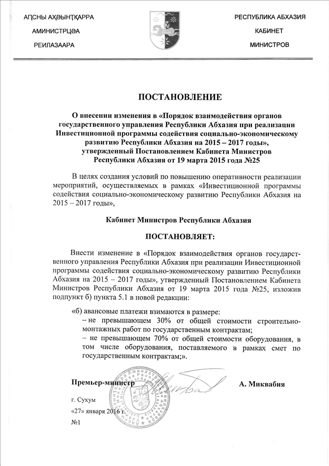 Постановление Кабинета министров Республики Абхазия от 27.01.2016 № 1 "О внесении изменения в "Порядок взаимодействия органов государственного управления Республики Абхазия при реализации Инвестиционной программы содействия социально-экономическому развитию Республики Абхазия на 2015-2017 годы", утвержденный Постановлением Кабинета Министров Республики Абхазия от 19 марта 2015 года № 25"