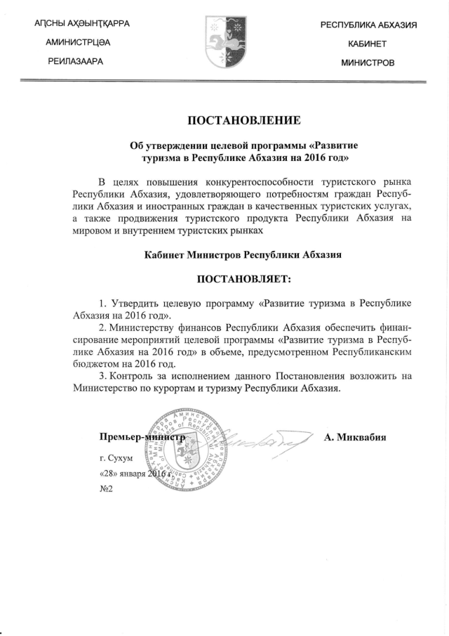Постановление Кабинета Министров Республики Абхазия от 28.01.2016 № 2 "Об утверждении целевой программы "Развитие туризма в Республике Абхазия на 2016 год"