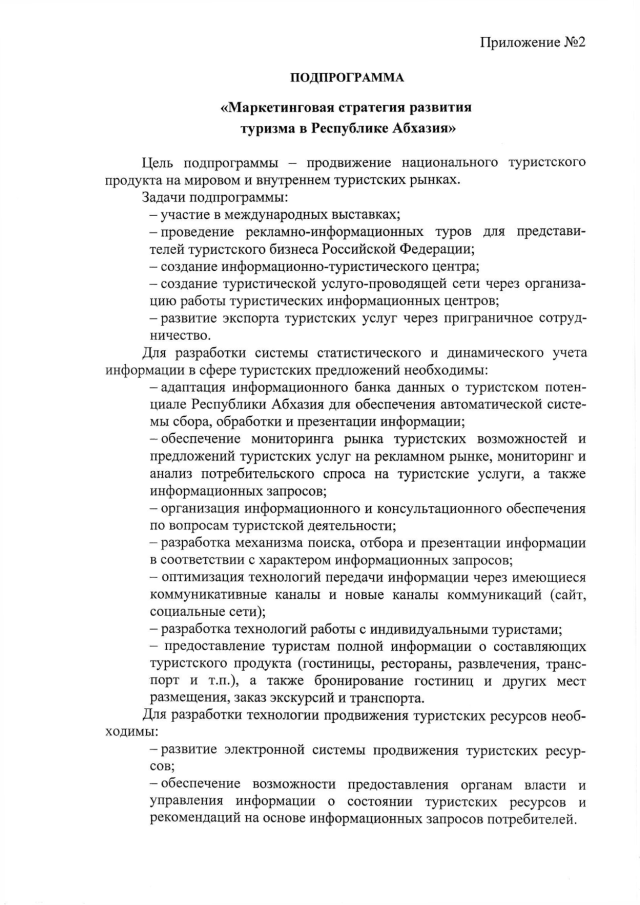 Постановление Кабинета Министров Республики Абхазия от 28.01.2016 № 2 "Об утверждении целевой программы "Развитие туризма в Республике Абхазия на 2016 год"