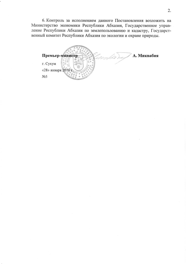 Постановление Кабинета Министров Республики Абхазия от 28.01.2016 № 5 "О предоставлении ООО "Гуандра" права пользования участком недр для добычи подземной питьевой воды в с. Гуандра Гулрыпшского района"