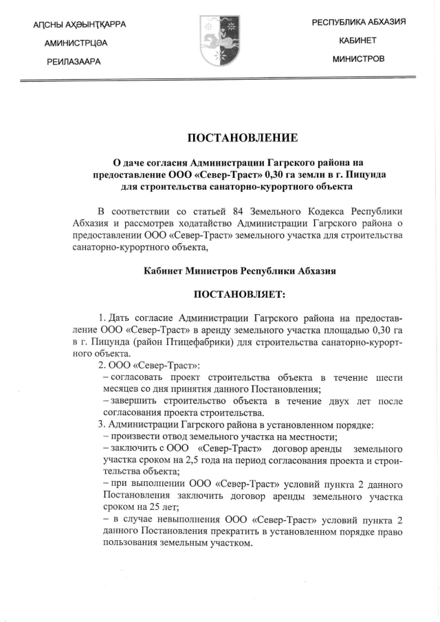 Постановление Кабинета Министров Республики Абхазия от 28.01.2016 № 8 "О даче согласия Администрации Гагрского района на предоставление ООО "Север-Траст" 0,30 га земли в г. Пицунда для строительства санаторно-курортного объекта"