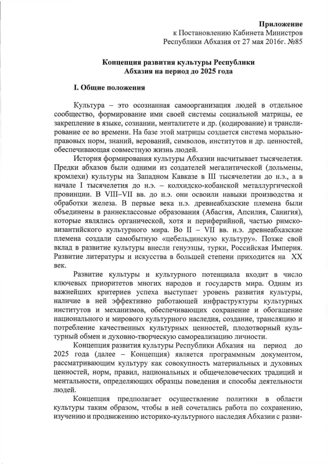 Постановление Кабинета Министров Республики Абхазия от 27.05.2016 № 85 "Об одобрении "Концепции развития культуры Республики Абхазия на период до 2025 года"