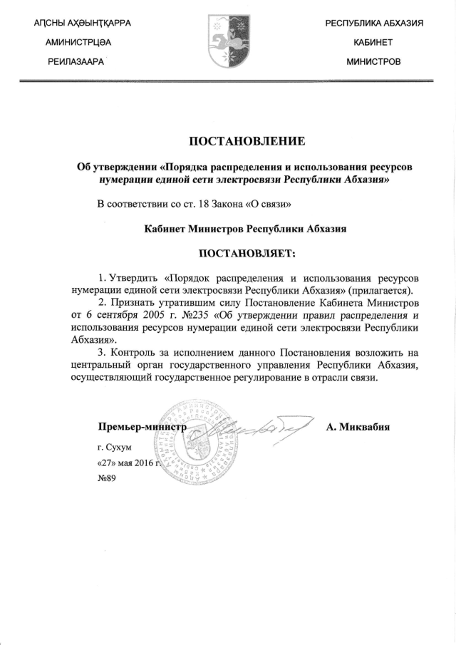 Постановление Кабинета Министров Республики Абхазия от 27.05.2016 № 89 "Об утверждении "Порядка распределения и использования ресурсов нумерации единой сети электросвязи Республики Абхазия"