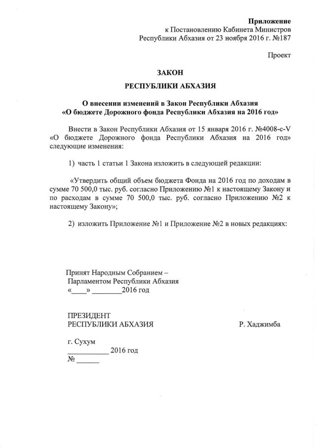 Постановление Кабинета Министров Республики Абхазия от 23.11.2016 № 187 "О проекте Закона Республики Абхазия "О внесении изменений в Закон Республики Абхазия "О бюджете Дорожного фонда на 2016 год"