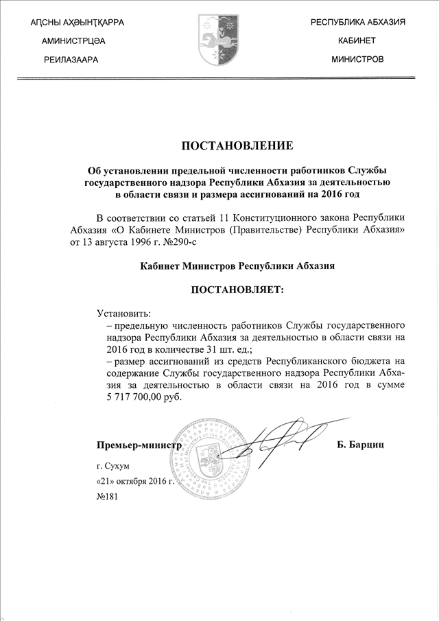 Постановление Кабинета Министров Республики Абхазия от 21.10.2016 № 181 "Об установлении предельной численности работников Службы государственного надзора Республики Абхазия за деятельностью в области связи и размера ассигнований на 2016 год"