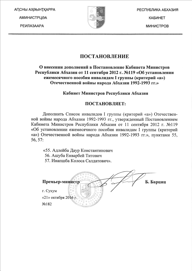 Постановление Кабинета Министров Республики Абхазия от 21.10.2016 № 182 "О внесении дополнений в Постановление Кабинета Министров Республики Абхазия от 11 сентября 2012 г. № 119 "Об установлении ежемесячного пособия инвалидам I группы (критерий "а") Отечественной войны народа Абхазии 1992-1993 гг."