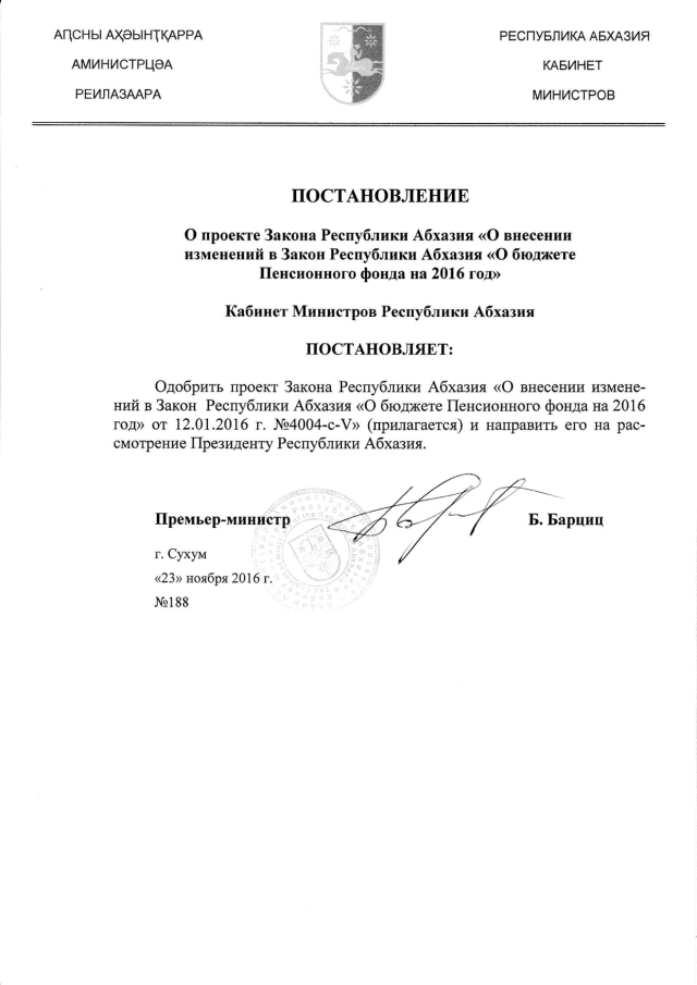 Постановление Кабинета Министров Республики Абхазия от 23.11.2016 № 188 "О проекте Закона Республики Абхазия "О внесении изменений в Закон Республики Абхазия "О бюджете Пенсионного фонда на 2016 год"