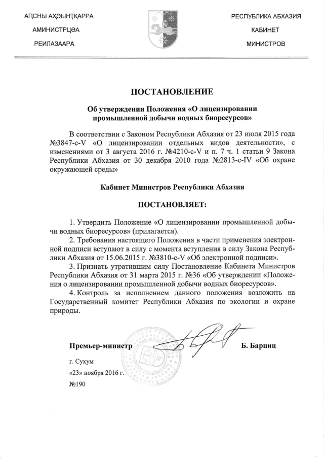 Постановление Кабинета Министров Республики Абхазия от 23.11.2016 № 190 "Об утверждении Положения "О лицензировании промышленной добычи водных биоресурсов"