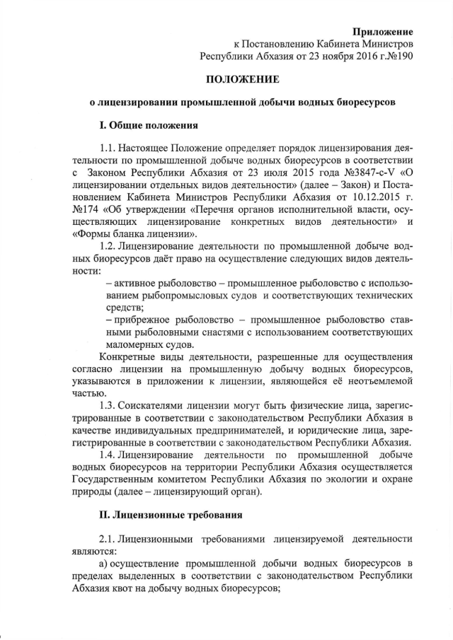 Постановление Кабинета Министров Республики Абхазия от 23.11.2016 № 190 "Об утверждении Положения "О лицензировании промышленной добычи водных биоресурсов"