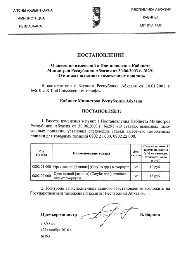 Постановление Кабинета Министров Республики Абхазия от 23.11.2016 № 193 "О внесении изменений в Постановление Кабинета Министров Республики Абхазия от 30.06.2003 г. № 291 "О ставках вывозных таможенных пошлин"