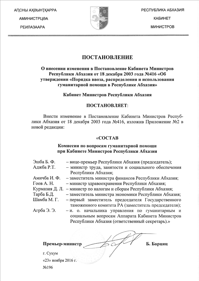 Постановление Кабинета Министров Республики Абхазия от 23.11.2016 № 196 "О внесении изменения в Постановление Кабинета Министров Республики Абхазия от 18 декабря 2003 года № 416 "Об утверждении "Порядка ввоза, распределения и использования гуманитарной помощи в Республике Абхазия"