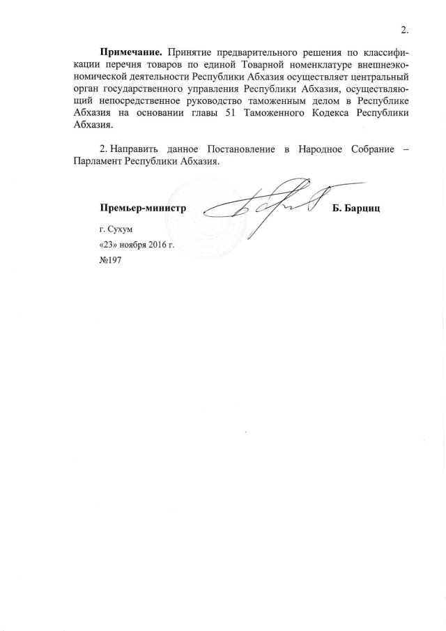 Постановление Кабинета Министров Республики Абхазия от 23.11.2016 № 197 "О внесении изменения в "Перечень технологического оборудования (в том числе комплектующих и запасных частей к нему), аналоги которого не производятся на территории Республики Абхазия, необходимого для создания производства товаров, ввоз которого на таможенную территорию Республики Абхазия не подлежит налогообложению (освобождается от налогообложения)", утвержденный Постановлением Кабинета Министров Республики Абхазия от 27 мая 2016 года № 87"
