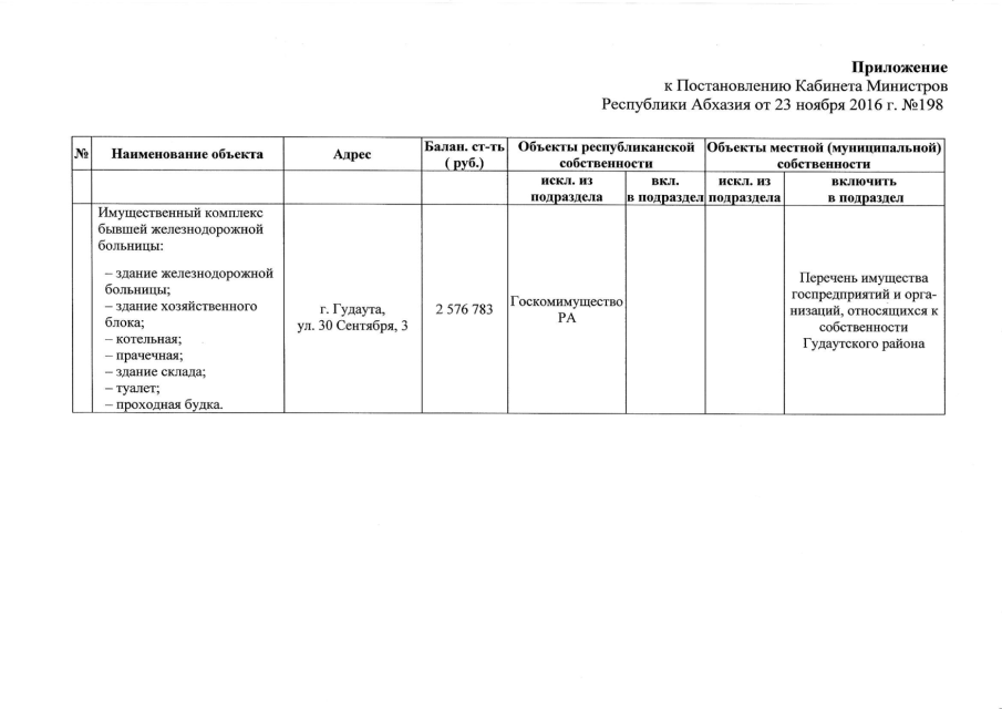 Постановление Кабинета Министров Республики Абхазия от 23.11.2016 № 198 "О передаче имущественного комплекса бывшей железнодорожной больницы в г. Гудаута в муниципальную собственность Гудаутского района"