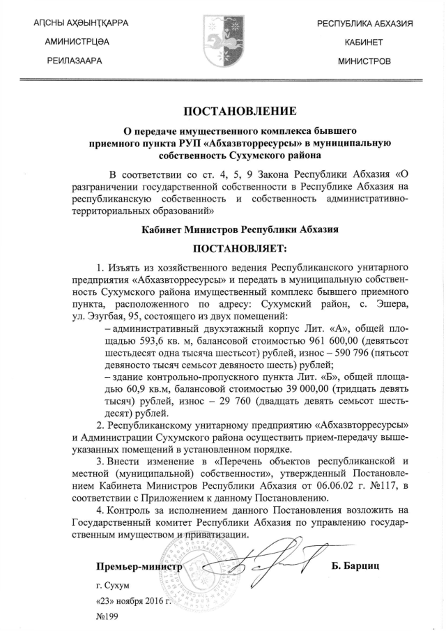 Постановление Кабинета Министров Республики Абхазия от 23.11.2016 № 199 "О передаче имущественного комплекса бывшего приемного пункта РУП "Абхазвторресурсы" в муниципальную собственность Сухумского района"